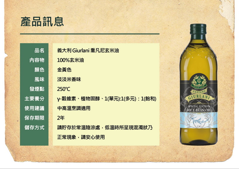 - 1.商品組合/規格:義大利Giurlani喬凡尼玄米油1000mlx2瓶